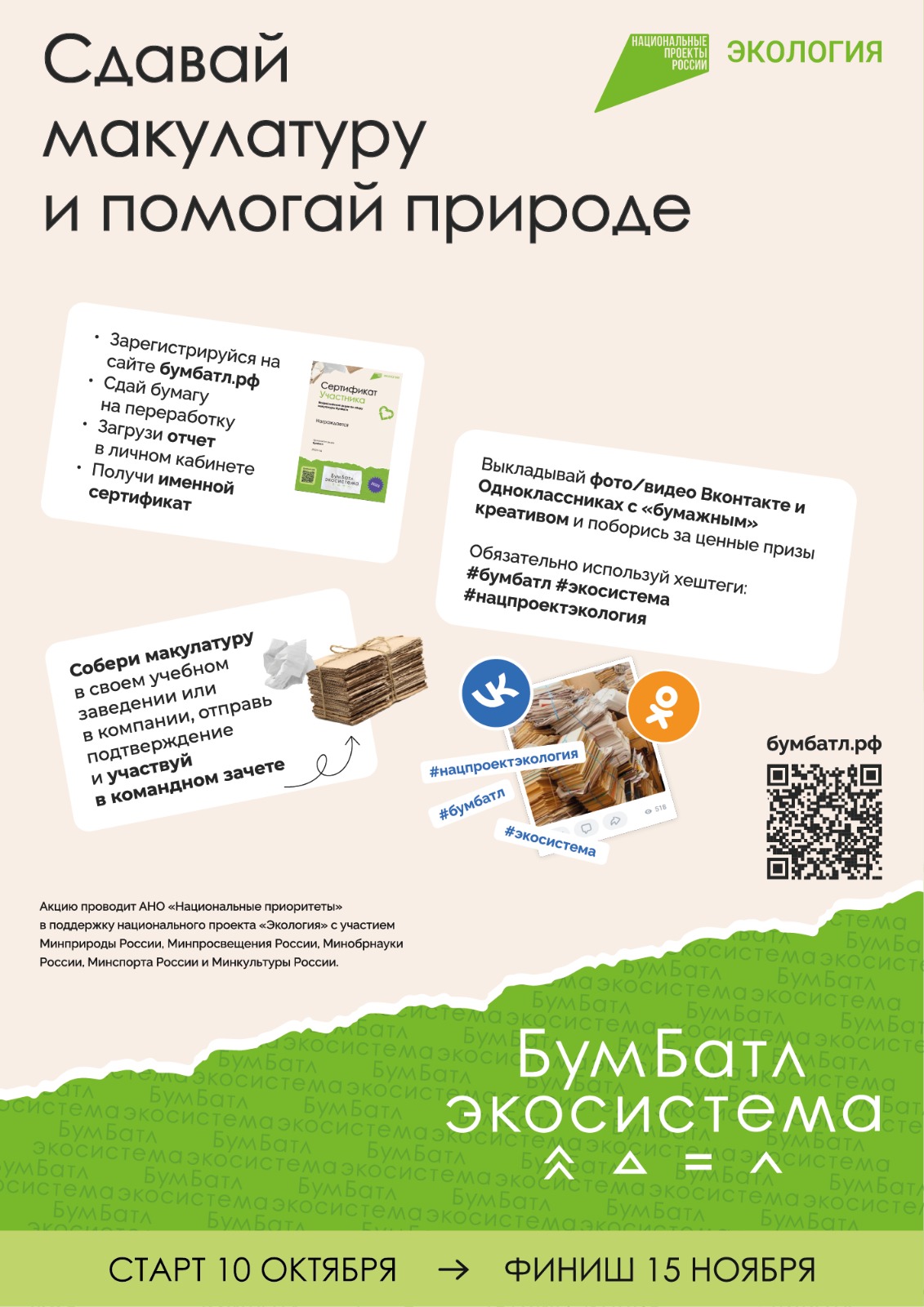 Четвертый сезон акции «БумБатл» стартовал 10 октября. В этом году масштабный экологический проект организован АНО «Национальные приоритеты» совместно с Всероссийским экологическим общественным движением «Экосистема». Ключевая цель акции – сокращение излишнего потребления бумаги, организация системы ее переработки и формирование экологической культуры.