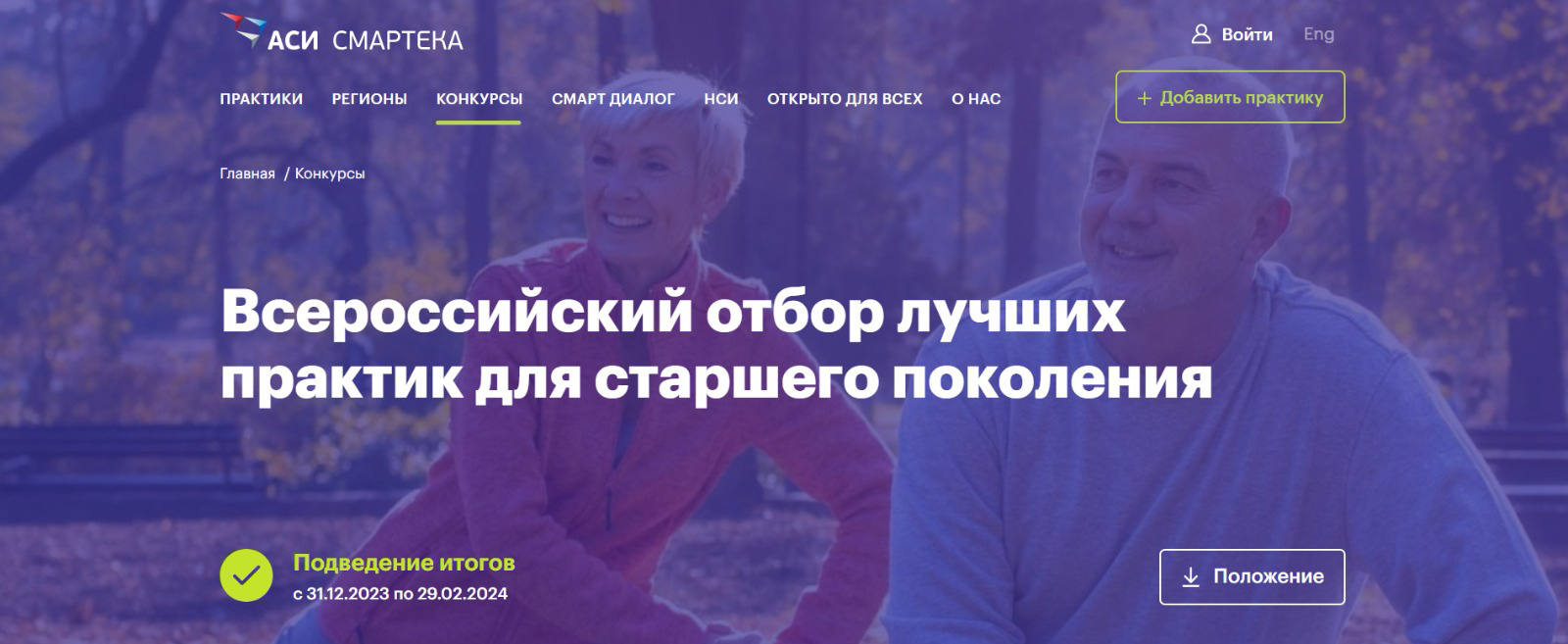 Отбор лучших практик активного долголетия организован АНО «Национальные приоритеты» при поддержке Министерства труда и социальной защиты Российской Федерации для развития национального проекта «Демография». Ежегодно отбор проводится на платформе АСИ «Смартека» в рамках Стратегии действий в интересах граждан старшего поколения в Российской Федерации. Задача отбора — выявление лучших инициатив, направленных на улучшение качества жизни людей старшего возраста, для их последующего тиражирования в регионах России. За четыре года проведения отбора на конкурс поступило 2942 заявки. Более 430 инициатив представлены в сборниках лучших практик активного долголетия.