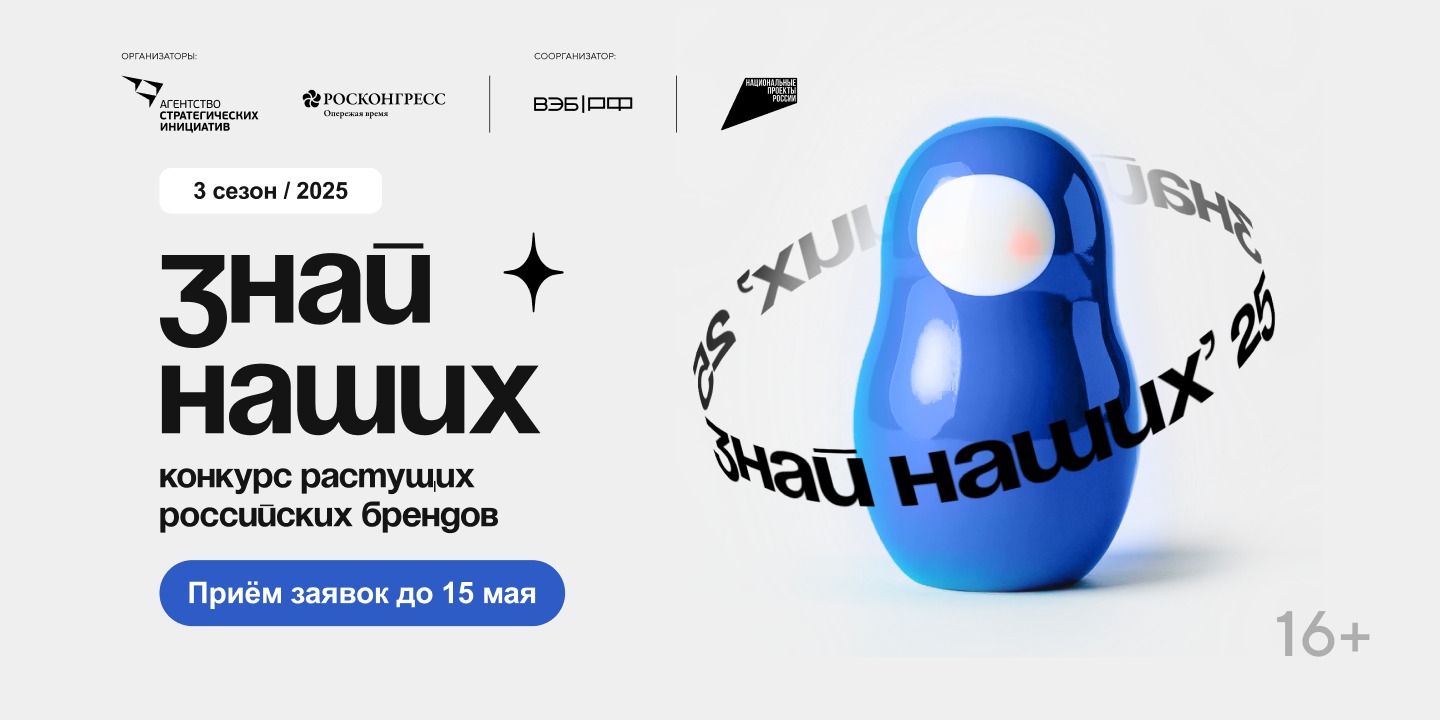 29.04.2025Продолжается прием заявок на конкурс «Знай наших»Конкурс растущих российских брендов решает задачи национальногопроекта «Эффективная и конкурентная экономика».Цель национального проекта - обеспечение устойчивогоэкономического развития, основанного на конкуренции,предпринимательстве, в том числе высокотехнологичном, и частнойинициативе.К участию в конкурсе приглашаются представители малого и среднегобизнеса, чьи компании демонстрируют устойчивый рост и высокую степеньлокализации производства. Заявки принимаются до 15 мая назнайнаших.аси.рф . Победители получат помощь в продвижении накрупнейших маркетплейсах и в торговых сетях, доступ к обучающимпрограммам, индивидуальные консультации с бизнес-экспертами, членство вбизнес-объединениях, бесплатное участие в ключевых мероприятиях, а такжегрантовую поддержку.Экспертиза и определение финалистов запланированы на май-июнь,церемония награждения состоится летом 2025 года в рамках форума«Сильные идеи для нового времени». Организаторы – АСИ и ФондРосконгресс. Соорганизатор – ВЭБ.РФ.В третьем сезоне заявки принимаются по пяти основнымноминациям и одной специальной:1. «Продукты питания» – номинация для тех, кто делает питаниеполезнее, доступнее и удобнее для современного ритма жизни:2. «Потребительские товары» – товары, которые делают нашу жизньудобнее, красивее и экологичнее:3. «Высокие технологии» – номинация для ИТ-компаний, которыеразрабатывают прорывные технологические решения на стыке науки,инженерии и инноваций.4. «Креатив» – для авторов нестандартных проектов в дизайне, моде иискусстве, ломающих шаблоны и создающих смелые, инновационныепродукты:5. «Информационные технологии» – номинация для отечественныхбрендов программных и аппаратных продуктов, которые могут бытьиспользованы для цифровизации предприятий любого размера и сферыдеятельности.6. «Специальные номинации» – отдельный блок для брендов суникальной миссией: «Бренды малых городов», «Культурный код», «Брендыисторических регионов», «Кавказские бренды», «Комфортная жизнь длязащитников отечества», «Молодежные бренды». В рамках конкурса такжебудут отмечены регионы, наиболее активно поддерживающие местныебренды.«Знай наших» – это возможность для российских брендов заявить осебе, получить поддержку и выйти на новый уровень развития. Российскийбизнес – это смелость, традиции и инновации. Первый сезон конкурсазапущен в 2023 году в рамках форума «Сильные идеи для нового времени».Проект реализуется в соответствии поручением Президента РФ. За два сезонана знайнаших.аси.рф поступило 17 тысяч заявок из всех 89 российскихрегионов. В 2024 году интерес к конкурсу вырос более чем в два раза:количество заявок увеличилось до 12026.Победители прошлых сезонов уже получили значительную поддержку:участие в ПМЭФ и ВЭФ, размещение на крупнейших медиафасадах страны,доступ к акселераторам и образовательным программам. Средний роствыручки победителей составил более 50%, а некоторые компании увеличилипродажи в 2–3 раза.